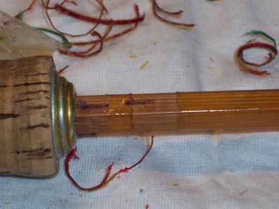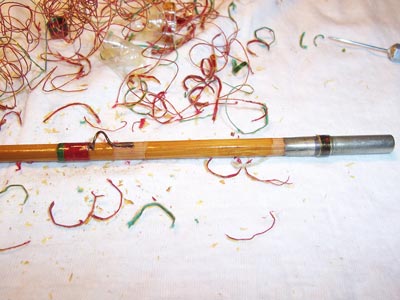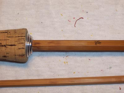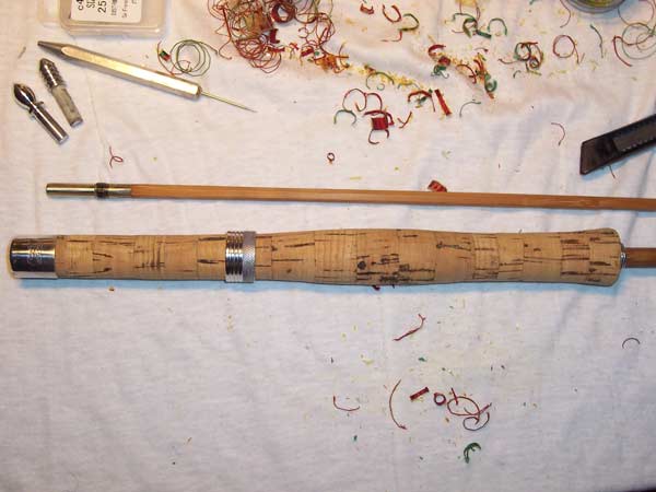 | L'impugnatura è finita e il portamulinello lucidato. La canna è completamente sverniciata e senza gli anelli guidafilo