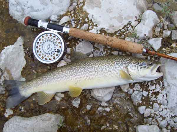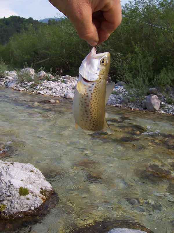 ![]() Con questo colore marrone la trota fario si mimetizza bene in queste acque |