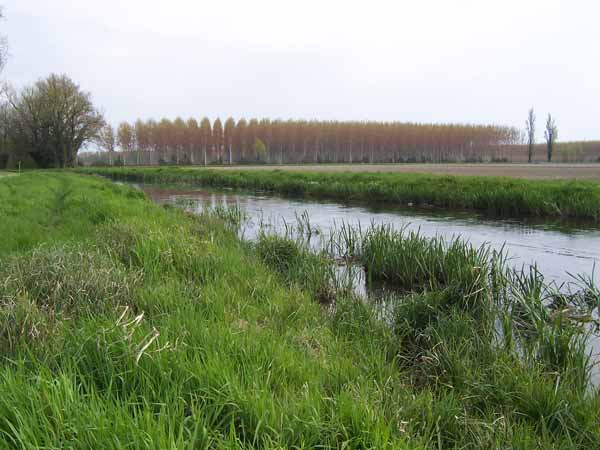 | Questo corso d'acqua si snoda in mezzo a prati e terreni coltivati |
