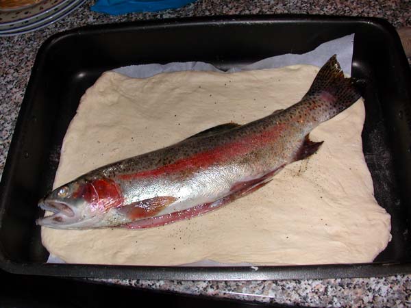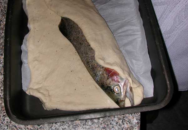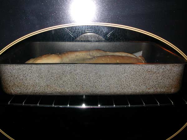 Aggiungete gli odori che preferite, avvolgetelo quindi in una sfoglia che farete con la pasta per il pane e deponetelo in una teglia. |