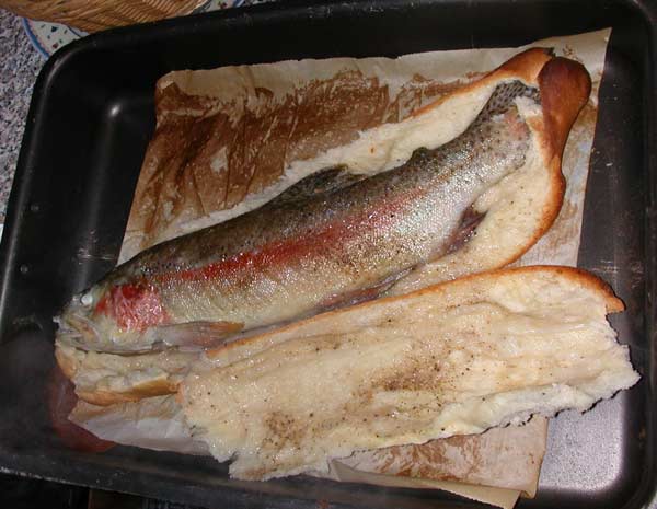 | Dopo aver pulito il pesce e averlo salato ne riempirete la pancia con l'impasto formato dal pane grattugiato il sale il pepe il prezzemolo l'olio d'oliva. |