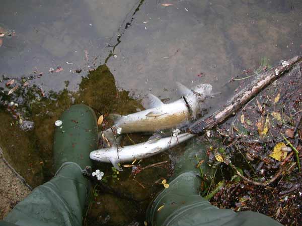 ![]() Purtroppo dopo tutte le foto precedenti che mostravano dei bellissimi esemplari di trote e temoli devo farvi vedere anche questa (e non è l'unica) che svela cosa si nascondeva sotto le foglie nelle zone di scarsa corrente. Si tratta di temoli, anche di notevoli dimensioni, morti da poco tempo e senza alcuna traccia di ferite o altro sul corpo. Strano fenomeno !!!! |